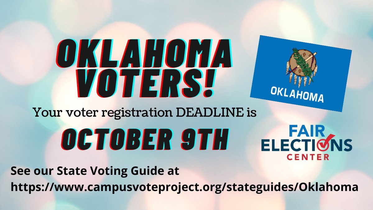🚨VOTING ALERT🚨#OK voters, today is your registration deadline. You must ACT NOW and sign up, in order to vote and have your voice heard. Our State Voting Guide has helpful links and info https://www.campusvoteproject.org/stateguides/oklahoma …pic.twitter.com/ySR2YlvMF2