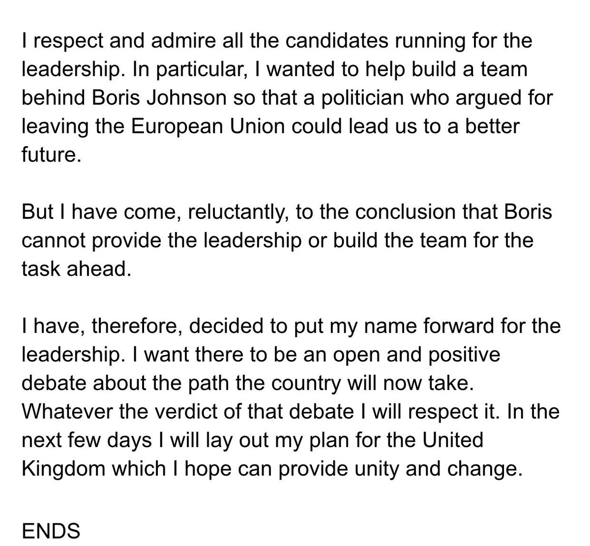 so in 1 statement admits: Lied about leadership ambition Lied to Boris about supporting him. And he thinks we should trust him?