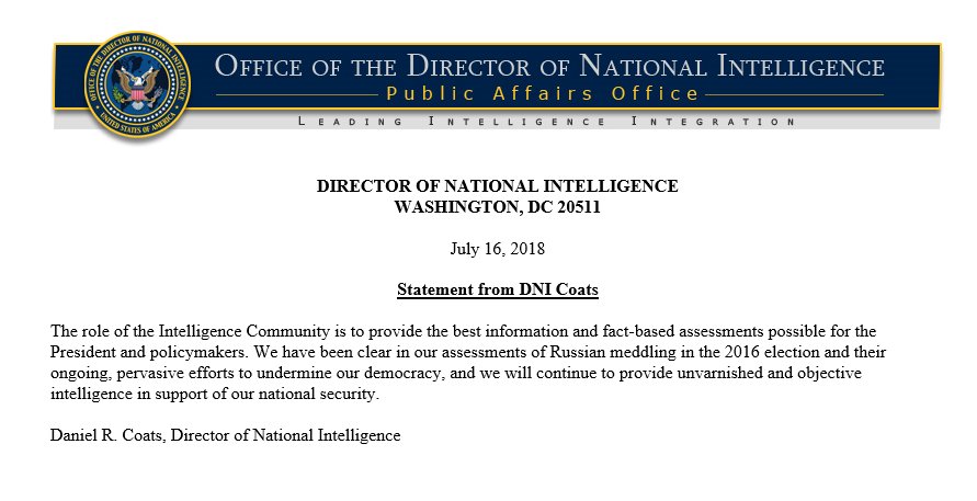 Statement from DNI Dan Coats, responding to, oh, nothing in particular: "We have been clear in our assessments of Russian meddling in the 2016 election and their ongoing, pervasive efforts to undermine our democracy."pic.twitter.com/0g1k7arPqv