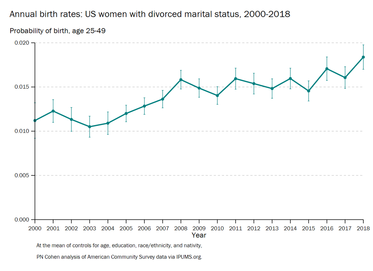 Now you know: Birth rates among US women with "divorced" marital status has risen from 2000-2018, across ages. (Why? I don't have time to look into this now but I hope someone does.)pic.twitter.com/RQQmwaSVbl
