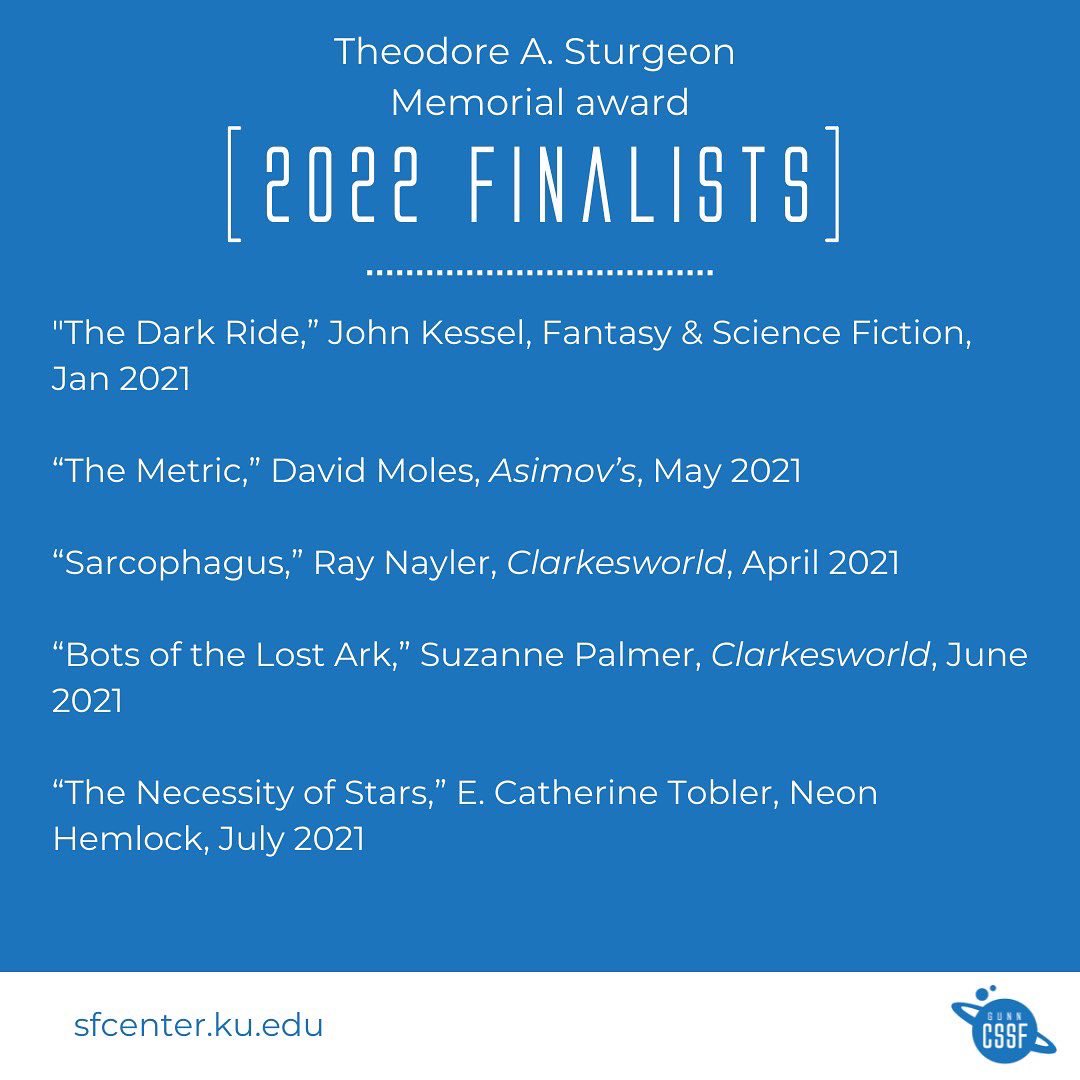 @fandsf writers John Kessel (Jan/Feb 2021 issue) and Nalo Hopkinson (Nov/Dec 2021 issue)@nalohop1 for being named finalists for the 2022 Theodore A. Sturgeon Memorial Award! Congrats to all the finalists!https://twitter.com/GunnCenter/status/1525286497410220034 …