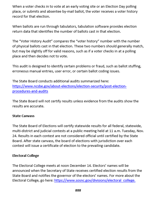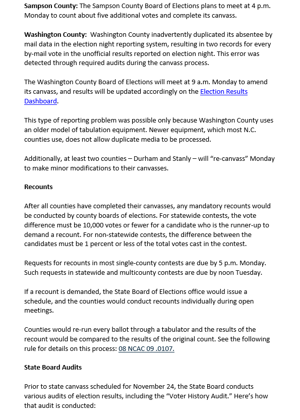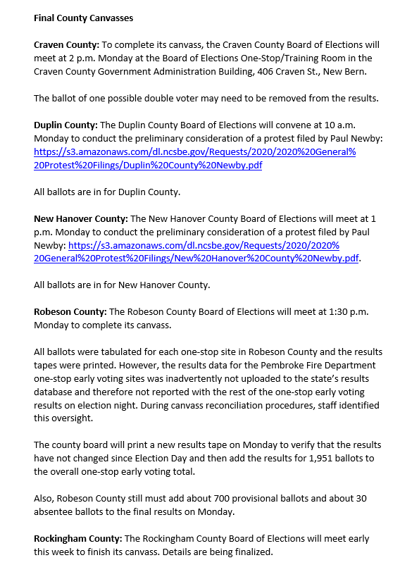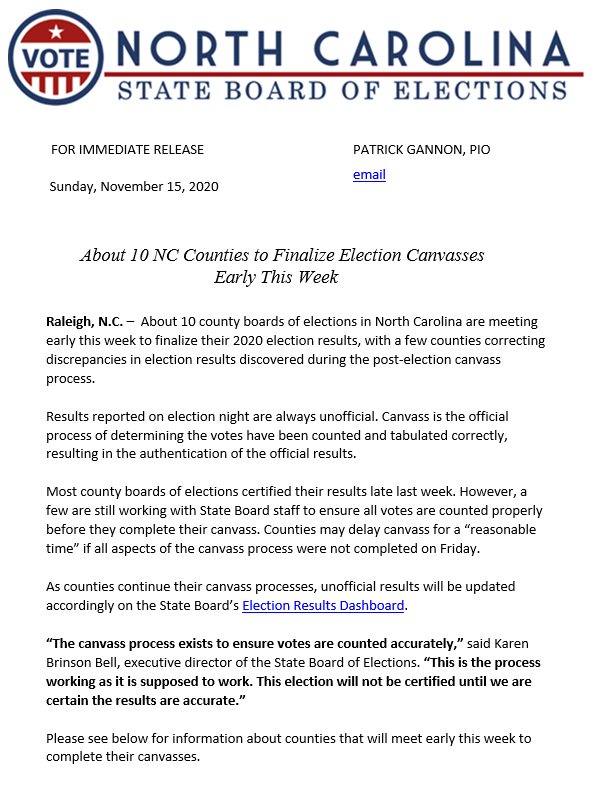 RELEASE: About 10 NC Counties to Finalize Election Canvasses Early This Week Read online: https://www.ncsbe.gov/news/press-releases/2020/11/15/about-10-nc-counties-finalize-election-canvasses-early-week …
