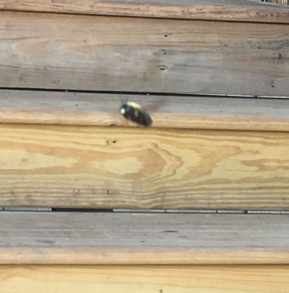 PSA: THIS BEE IS A FRIEND if you ever see a bee like this, thumb-sized, dark wings, white face, shiny black abdomen, it’s a male carpenter bee! HE CANNOT STING YOU. He may bump you or chase you because he is defending his territory. But he cannot harm you, please don’t harm himpic.twitter.com/945YhfNRvv