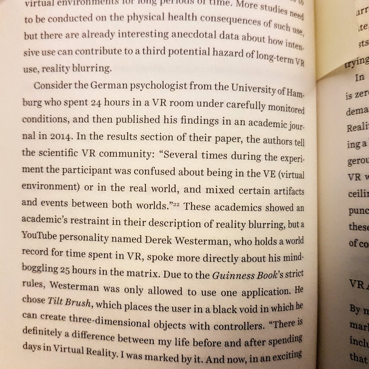 #VR workshop, reading a book by Jeremy Bailenson from@StanfordVR. Suddenly he mentions a ›German psychologist from the University of Hamburg‹ who spent 24 hours in VR. Well, hello Frank