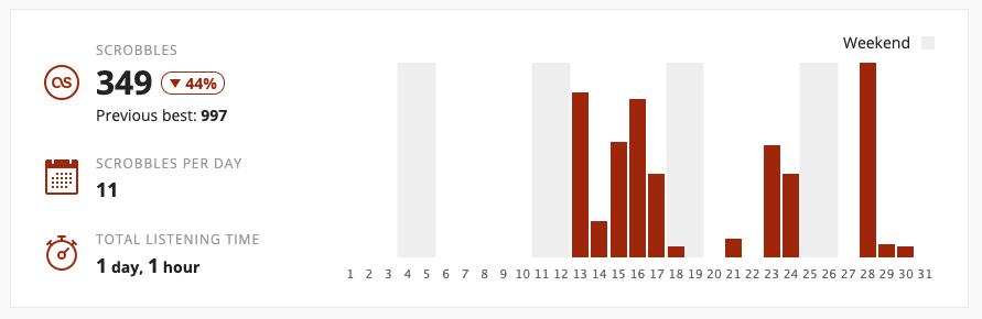 @lastfm's monthly reports. lots of traveling this January, so less listening than usual - 349 plays.pic.twitter.com/LqtzcWO2Mz