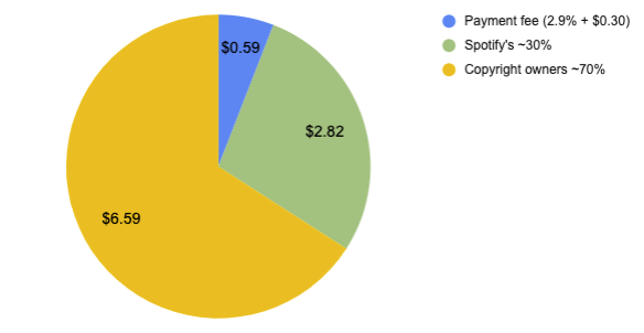first, there are payment processing fees. Spotify probably has a better deal than the standard Stripe rate (2.9%+$0.30), but let's just use that to keep things simple. we also know that Spotify pays around 70% of its revenue to rights owners, and we get something like this:pic.twitter.com/O4pZL9oIvi