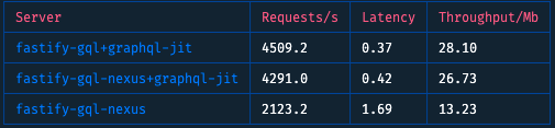 @benawad I use@prisma nexus so I added benchmarks in my branch https://github.com/jagreehal/node-graphql-benchmarks/tree/adds-fastify-nexus-benchmarks …. Using@fastifyjs and graphql-jit the results look good… a lot better than with type-graphqlpic.twitter.com/30Maz3Tgpx