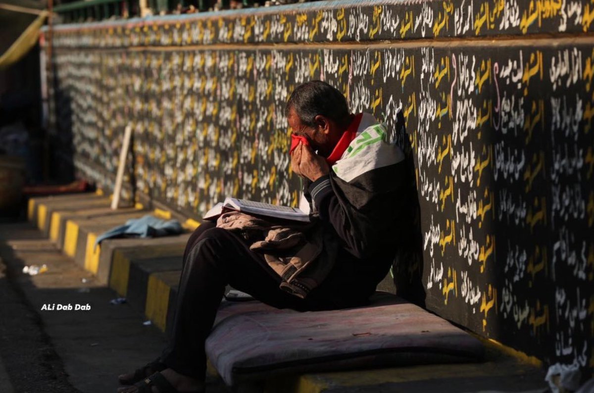 هذه الصورة كسرت قلبي. رجل يمسح دموعه بالعَلَم وهو يقرأ القرآن. خلف ظهره أسماء مئات الشهداء الأبطال. يا للعبء! يا للحزن! أريد أحضنك عمي وأبوس راسك!