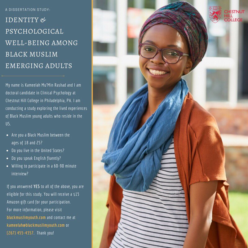 BMPC Founder Kameelah Rashad, MS is recruiting Black Muslim youth (18-25yo) for her dissertation research titled: Identity & Psychological Well-Being Among Black Muslim Emerging Adults. For more info/eligibility: kameelah@blackmuslimyouth.com http://www.blackmuslimyouth.com pic.twitter.com/fpUXvt0O1B