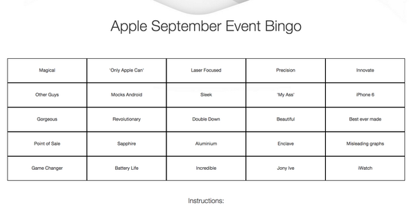 #AppleEvent Bingo! Shout if you get full house: http://owenwillia.ms/applebingo Created by@ow |#AppleLive#iPhone6pic.twitter.com/PR4kyims3W