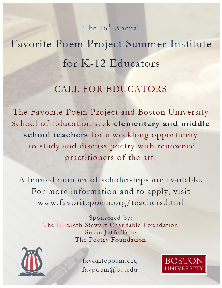 If you're a K-12 teacher who loves poetry, check out the Summer Poetry Institute! Click here to apply: http://www.favoritepoem.org/teachers.html