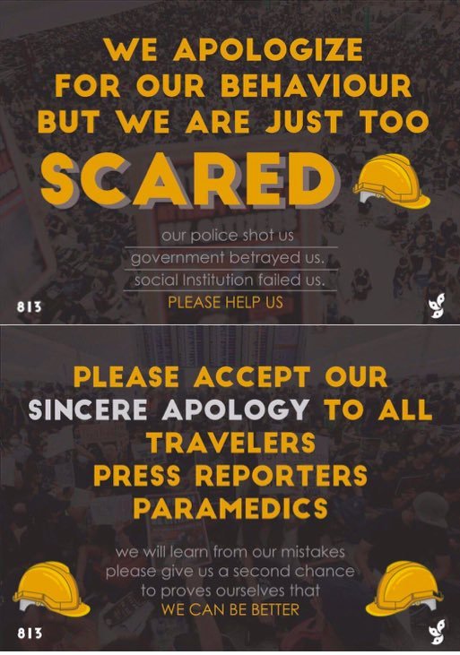 The self-reflection and responsibility shown by Hong Kong's generally young protesters is impressive. They've been protesting for 10 weeks, just hoping to keep some basic rights. (Their visual refers to the young medic who lost an eye last week). https://www.nytimes.com/2019/08/14/world/asia/hong-kong-airport-protests.html …pic.twitter.com/gOPDTUiRsC