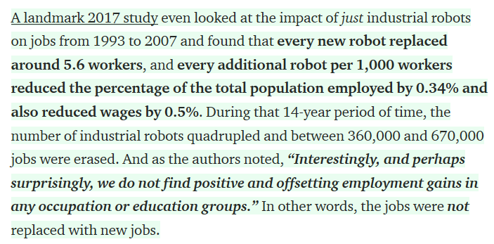 "According to our estimates, one more robot per thousand workers reduces the employment to population ratio by about 0.18-0.34 percentage points and wages by 0.25-0.5 percent." Robots and Jobs: Evidence from US Labor Markets by Daron Acemoglu et all.
