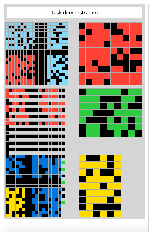 Playing around with @fchollet's Abstract Reasoning Corpus. The app can be run locally just by downloading the repo https://github.com/fchollet/ARC  . Somewhat relieved that I can solve the tasks myself! Now, how can we crack this with a neural network?pic.twitter.com/6RSBHrAoPU