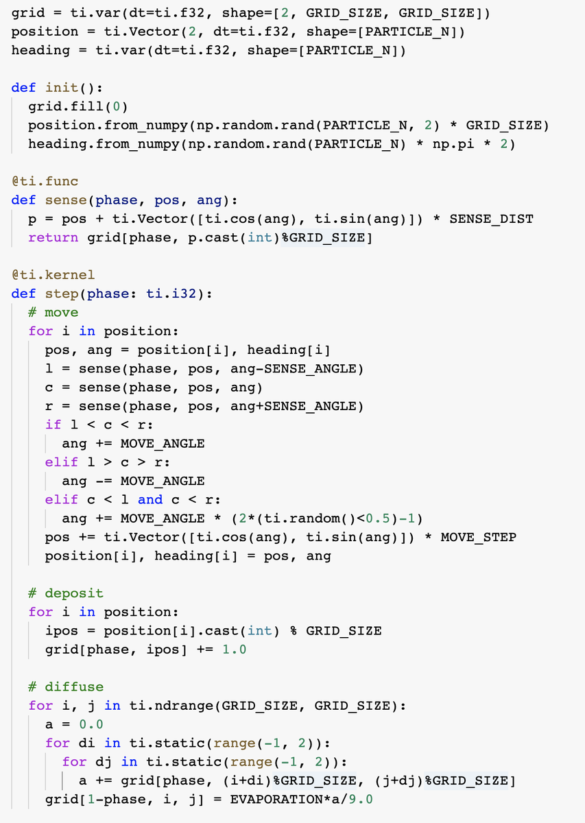 I often complain about NumPy-ish frameworks (TF, jax, torch) being inefficient for anything less conventional. Here is a benchmark of today, 10k iters of Physarum: TF - 11.9 s, Taichi - 240ms. Taichi is 40-50x times faster and the code is more readable.pic.twitter.com/Ey6zcbbOp5