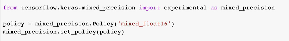 This how to train a Keras model in mixed precision (float32 weights & float16 computation). After this line, you can proceed to build a model and call `fit()` -- no other requirements. It provides a nice speed boost, esp. for image models Detailed guide: https://www.tensorflow.org/guide/mixed_precision …pic.twitter.com/rZyg13BSOa