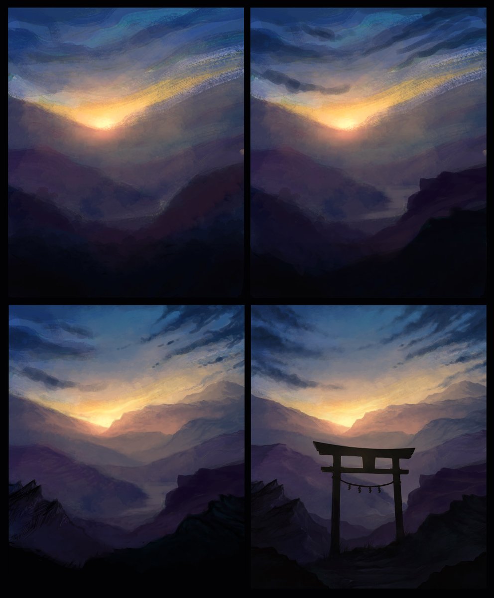 Painting process. 1. Broad strokes to figure out the colors and composition 2. Add more brush strokes 3. Keep adding more brush strokes 4. Just finish the thing alreadypic.twitter.com/uBd9Mh7KhN