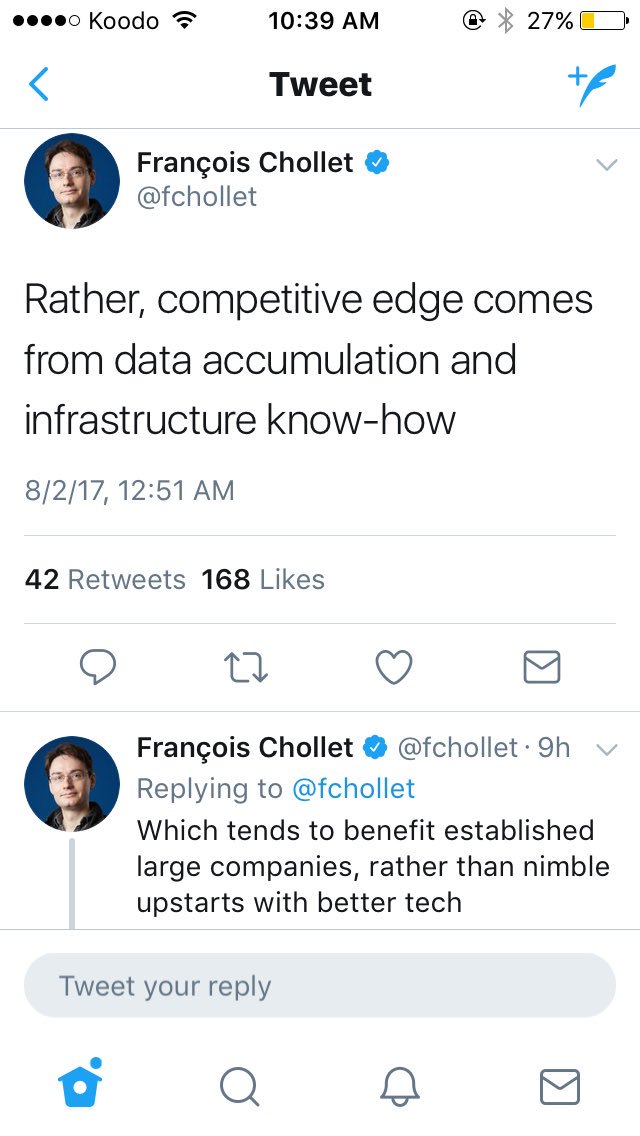 Agreed. Like ML, any other example in history when infrastructure know-how n data accumulation was advantage?