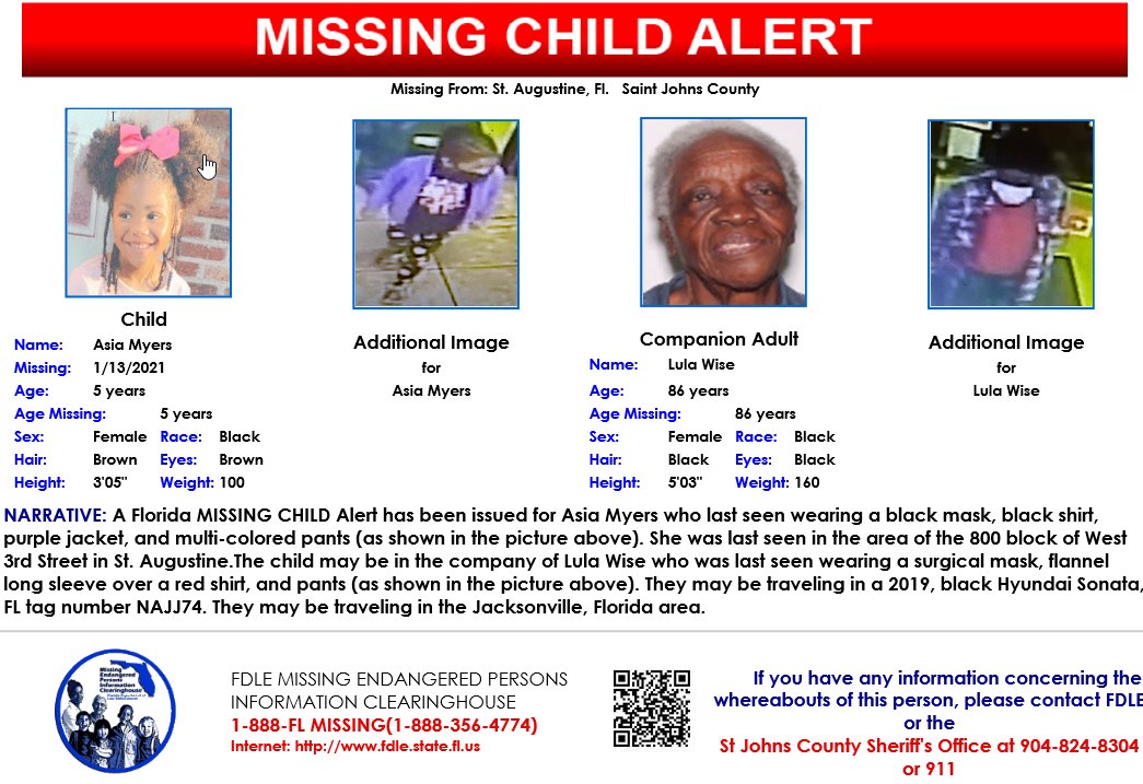 Updated - Please Share! A Florida Missing Child Alert has been issued for 5-year-old Asia Myers. The child may be in the company of Lula Wise. They may be traveling around the Jacksonville, Florida area in a 2019, black Hyundai Sonata, FL tag number NAJJ74.pic.twitter.com/uW2cktiPIt