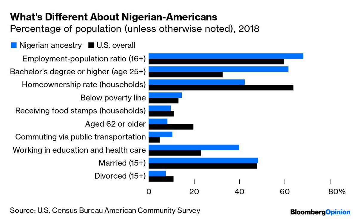 Nigerian-Americans are better-educated and more likely to have a job than the rest of us, and have somewhat higher median household incomes ($68,658 vs. $61,937), but they're also more likely to rent and take the bus (presumably because they live in cities)pic.twitter.com/xIEiu5JNwQ