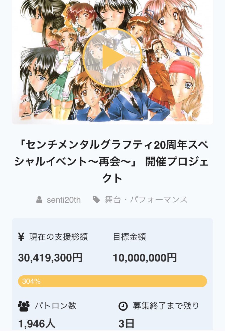11/8 12:50現在 (制限ありのストック) キャラグッズA 180(未処理分 4) 目標達成率304% パトロン数1,946人 まだまだ伸び続けてます……CAMPFIRE歴代9位タイまで、あと36,200円です! 皆様、支援忘れはございませんか? #センチメンタルグラフティ #センチ20thpic.twitter.com/jFi2runzIB