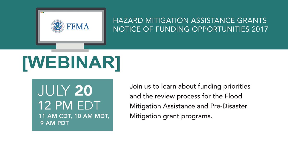 We're hosting a webinar (7/20) for the Flood Mitigation Assistance and Pre-Disaster Mitigation Grant programs at https://fema.connectsolutions.com/nofo .pic.twitter.com/Os684Fkw7j