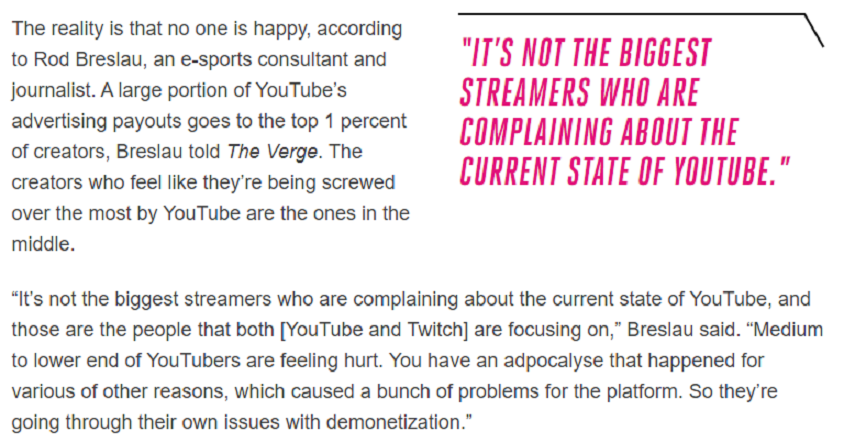 i spoke to The Verge about growing frustration from YouTube creators on monetization concerns, with many Twitch streamers feeling the same way just like in life, Twitch and YouTube are catering to the 1% while everyone else suffers https://www.theverge.com/2020/2/4/21121370/youtube-advertising-revenue-creators-demonetization-earnings-google … https://twitter.com/Slasher/status/1224440405179039746 …pic.twitter.com/smoeeDtXKK