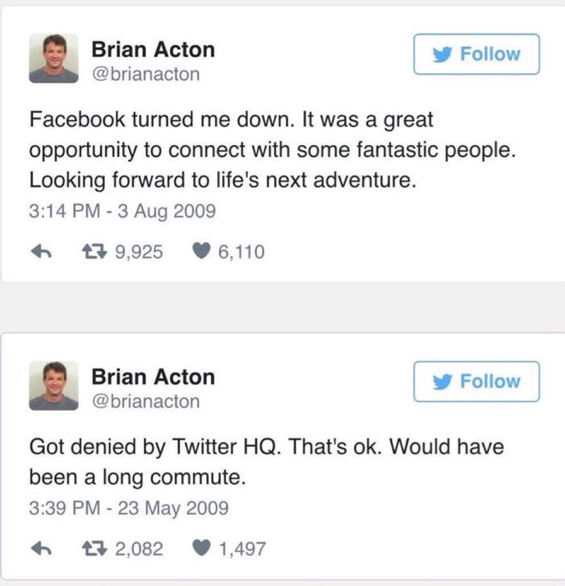 2009: he was turned down by Twitter & Facebook 2014: sold his company WhatsApp to