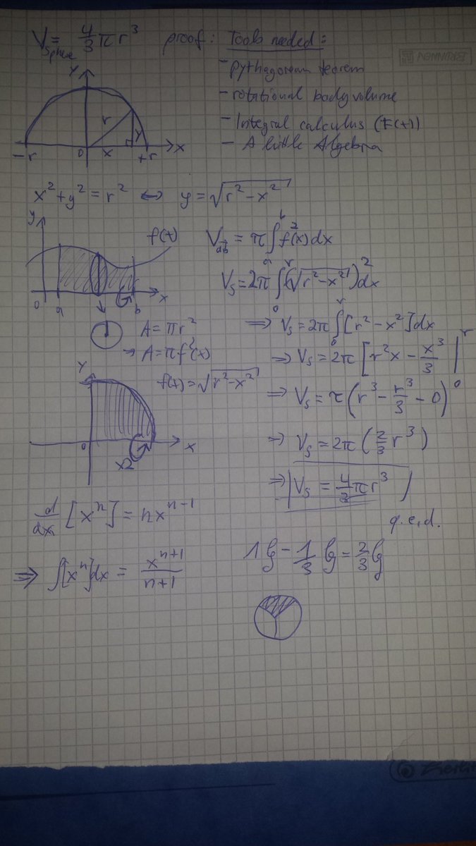 Easily provable by integrating a halfcircle and rotating by x-axis: V = integral from -r to r of π(r^2 -x^2)dx = (4πr^2)/3pic.twitter.com/LZOYaFui1n