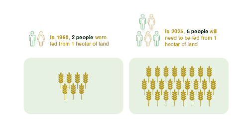 Since 1960 the global population has increased by around 130%, whereas the amount of arable land has increased by just 10%.