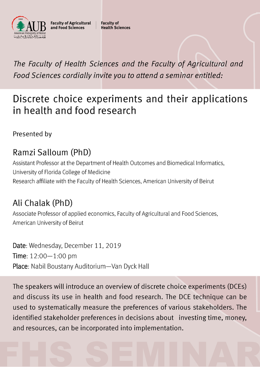 #FHS_seminar with@ramzi_salloum and@AliChalak3 from@AUB_FAFS on discrete choice experiments#DCEs and their use in#health and food research! Be many! http://bit.ly/2sSp1p5@AUB_Lebanon@fhschapter@UFHealth@UFMedicine#FHSpic.twitter.com/lJOGwr6Dut