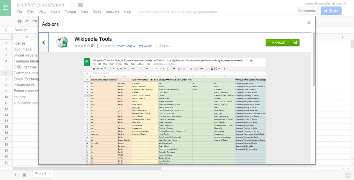 The Wikipedia Tools for Google Spreadsheets are now available as an official Sheets Add-On: https://chrome.google.com/webstore/detail/wikipedia-tools/aiilcelhmpllcgkhhpifagfehbddkdfp?utm_source=permalink …. pic.twitter.com/MKAEozdE4T