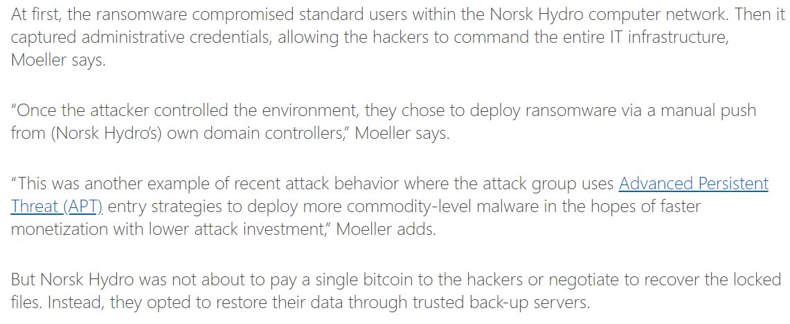 if you haven't already -- read this blog post about the March 2019 ransomware attack against Norsk Hydro. https://news.microsoft.com/transform/hackers-hit-norsk-hydro-ransomware-company-responded-transparency/ … this attack spread across 40 countries and thousands of devices.pic.twitter.com/kf46GtBiYk