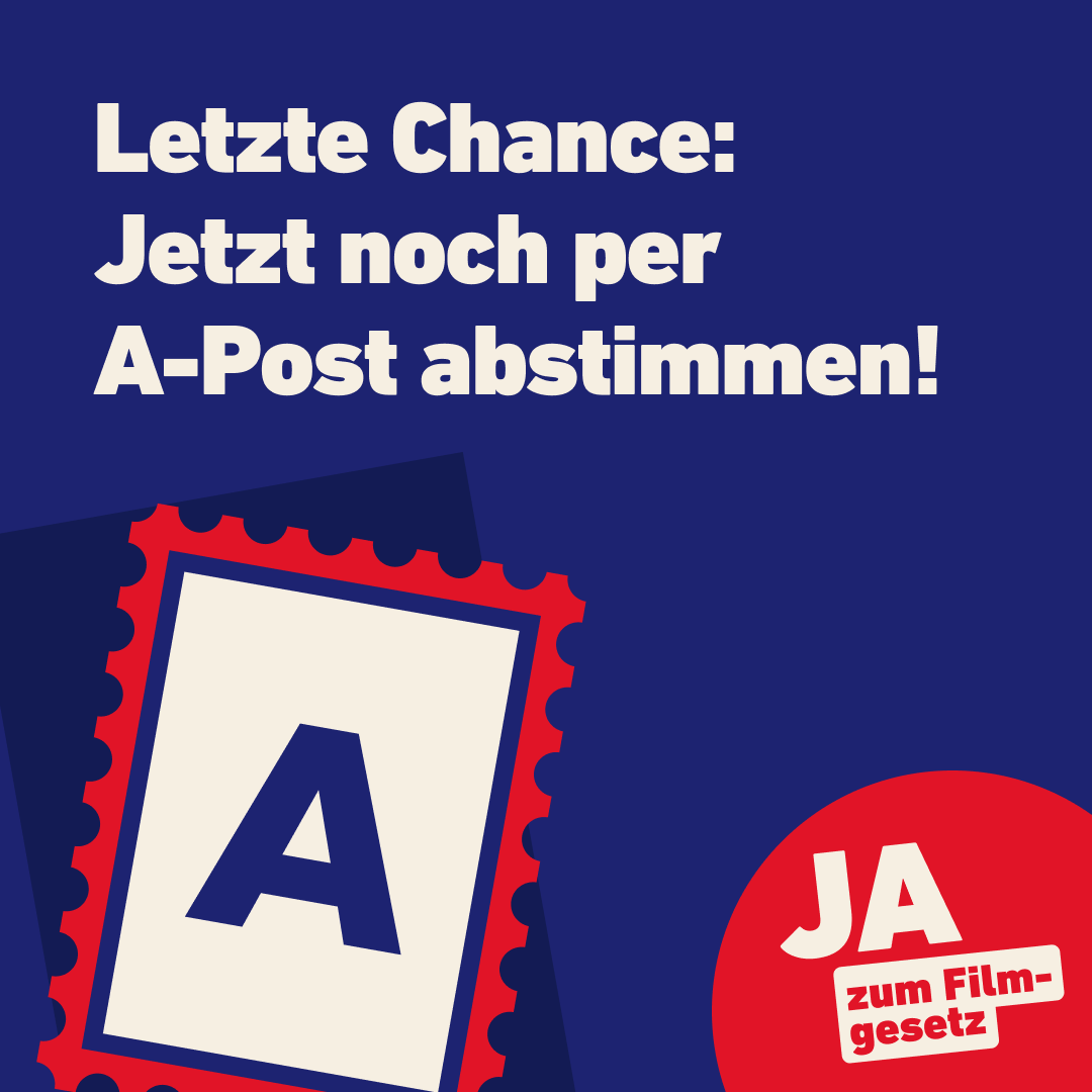 Am Mittwoch und Donnerstag kannst du noch brieflich per A-Post abzustimmen. Also los: A-Post-Marke aufs Couvert und ab in den Briefkasten mit deinem JA zum Filmgesetz