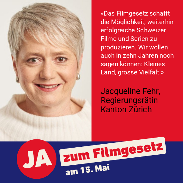 @jacquelinefehr, Regierungsrätin Kt. Zürich, ist klar für das#Filmgesetz. Damit in der Schweiz weiterhin erfolgreiche Filme und Serien produziert werden können. Das Motto ist: "Kleines Land, grosse Vielfalt."