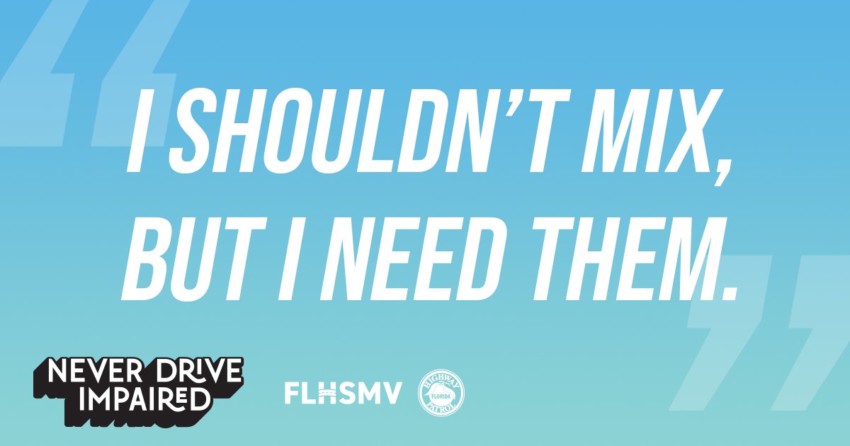 “I shouldn’t mix, but I need them.” Prescribed medication can create adverse reactions when mixed with other meds, over-the-counter drugs, and substances such as alcohol. Follow the directions and learn warning signs so that you never drive impaired. http://flhsmv.gov/NeverDriveImpaired …pic.twitter.com/yW96m5NxMb