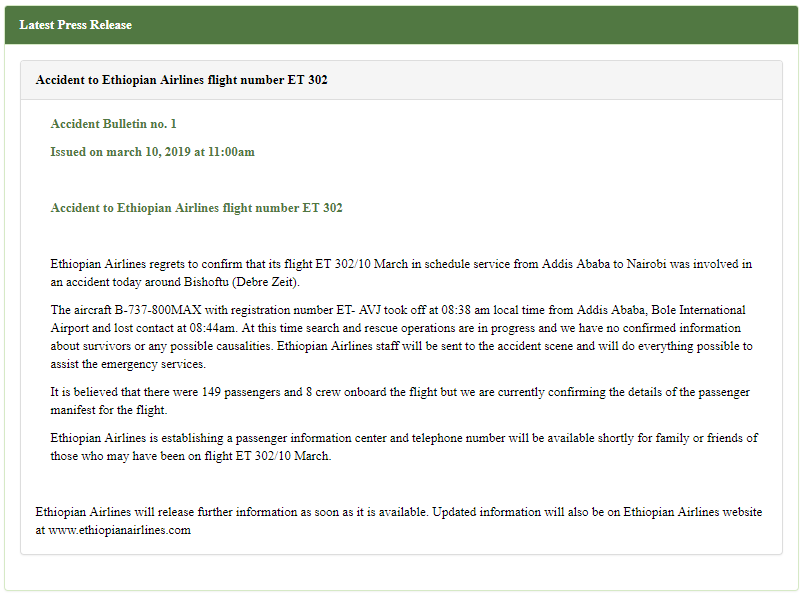 Press release from Ethiopian Airlines regarding flight #ET302pic.twitter.com/TOK5EZ1a7l