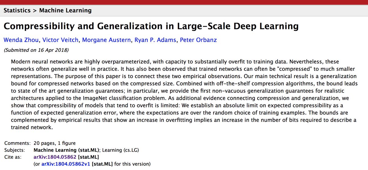 Yet another paper using compression to get generalization bounds (on large neural networks). One difference, this paper does the hard work to actually turn them into nonvacuous bounds. I think this step is important. https://arxiv.org/abs/1804.05862