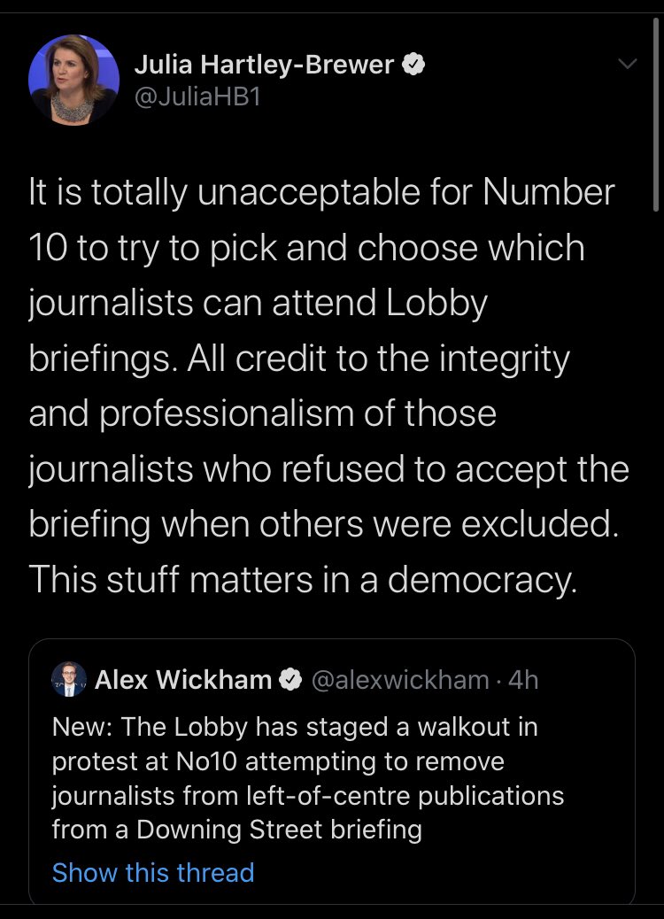It’s probably Bad For Democracy that the government has such little respect for/fear of senior political correspondents that it will just come right out and say it’s been meeting them behind everyone else’s backs... But it is also a bit funny.https://twitter.com/flying_rodent/status/1224388513430482944 …