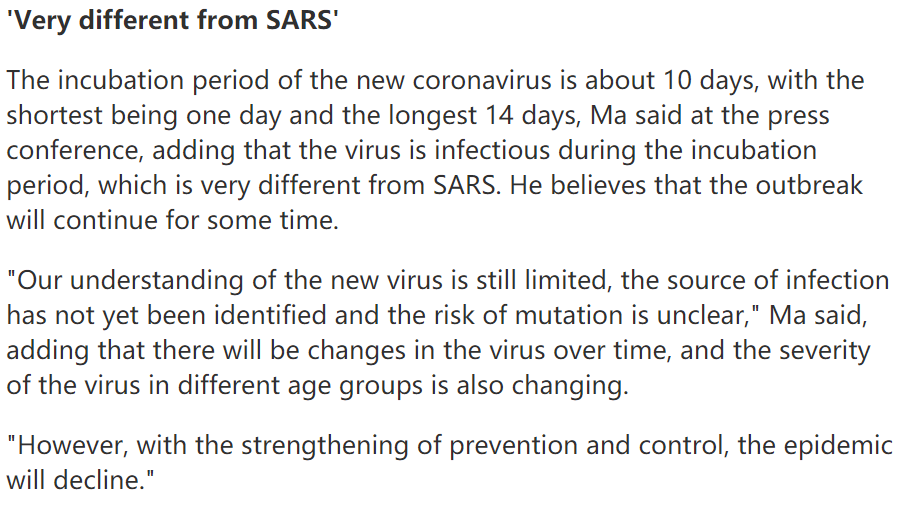 4) China’s National Health Commission minister: “The virus is capable of transmission even during incubation period... Some patients have normal temperatures. There are hidden carriers.” ==> Yet another clue how new