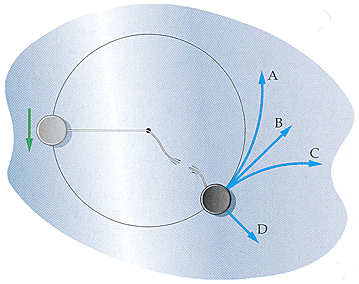 Sparkler in circular motion nicely shows sparks flying off tangent to the circle: https://youtu.be/BLC_9rZxagw