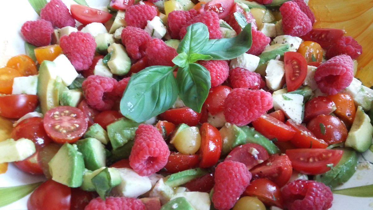 #salad tricolore of tomato avocado and mozzarella with fresh raspberries. Lovely fresh taste on a hot day.pic.twitter.com/31abdZE7cx