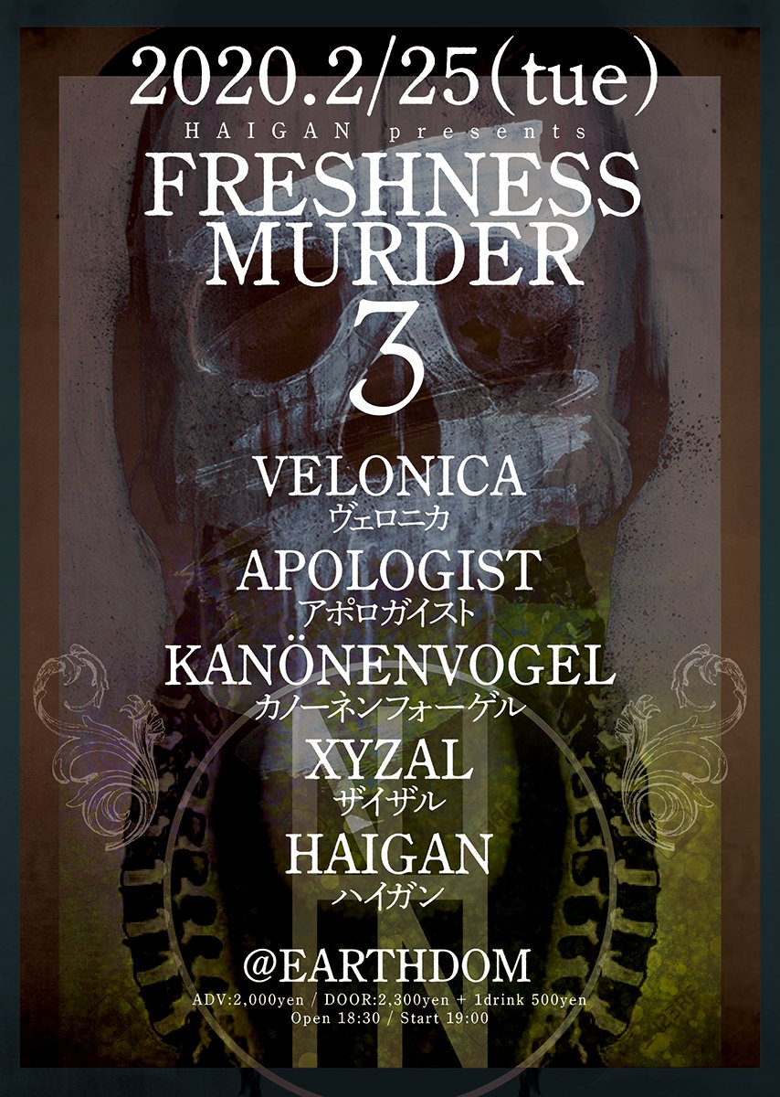 事故物件!? いや奇跡な企画だと思います! ぜひお越しを! HAIGAN presents “FRESHNESS MURDER vol.3” 2020.2/25(tue) 新大久保EARTHDOM ●VELONICA ●APOLOGIST ●KANÖNENVOGEL ●XYZAL ●HAIGAN ADV:2,000yen DOOR:2,300yen +1d(500yen) Open.18:30 / Start.19:00 ※前売りはDMでも受付中。pic.twitter.com/5YgMJGsaR4
