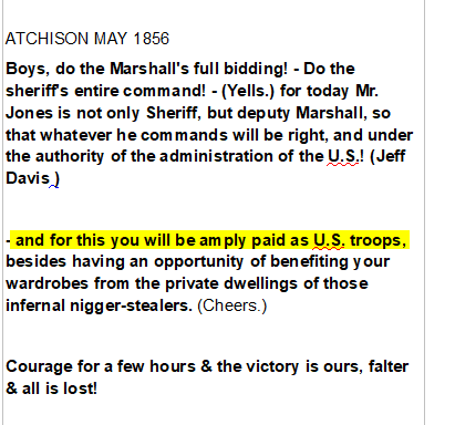 Earl I can check with you tomorrow, see how you are doing with memorizing it. There are dozens of other documents by South leaders boasting of killing to spread slavery-- with crowds cheering. This was 1856 speech, to paid men from Texas, over 1000 of them. Just arrived.