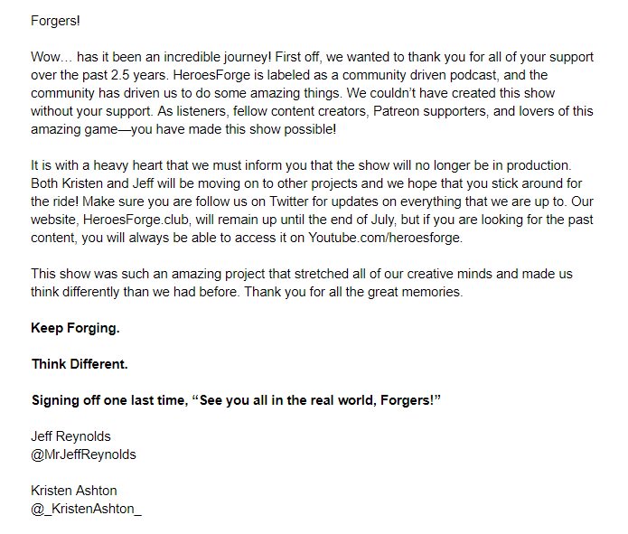 If you've followed me on Realm Maintenance, you know I mentioned this show often. I'm really going to miss it.https://twitter.com/ForgeHeroes/status/1003348782136811520 …