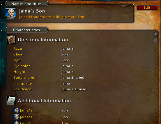I once RPed with someone who said he was Jaina's illegitimate son, and his literal only character trait was that he was Jaina's illegitimate son.