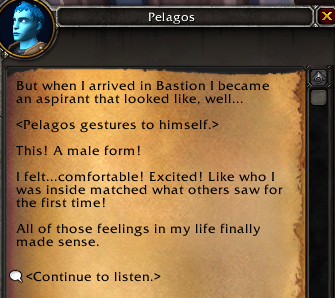 Pelagos, a prominent transgender character in #Shadowlands, now has a dialogue option with the player discussing his identity and past memories. #Warcraft https://www.wowhead.com/news=316944/pelagos-wows-first-transgender-character-on-his-identity-in-shadowlands …pic.twitter.com/1mFdokiM8W