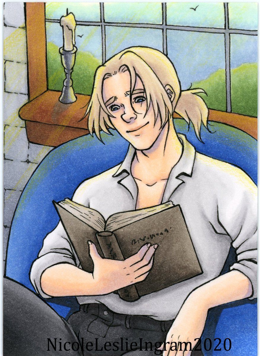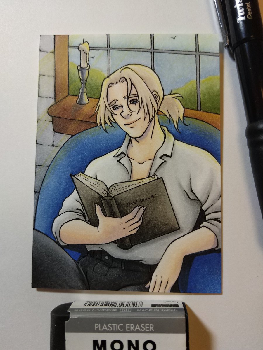 Photos are too full, scans can be too bright, but either way, Anduin is happily reading his book in this sketch card! The card is 2.5"x3.5" (6.35x8.89cm), trading card size. Sigh, I just want this boy to be happy, I'll tell you hwhat.pic.twitter.com/SsckN8wKyV