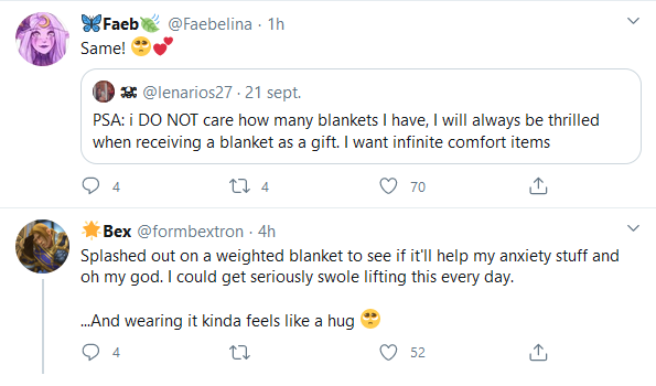 ive gotten so used to mine that i dont even notice the weight anymore until i try to use my boyfriend's blanket and was like.... theres nothing on me