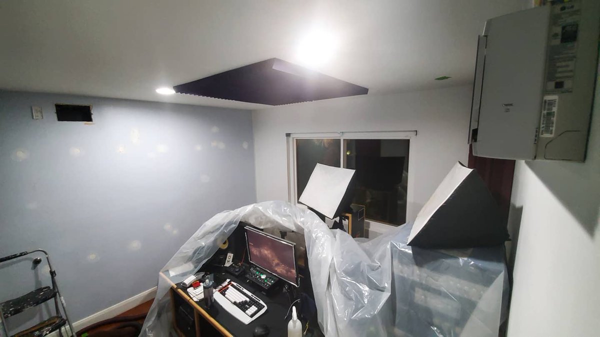 It's hard to remodel a studio that can't be out of use/emptied - gotta work on 1 wall at a time. Here's how I'm trying to ensure drywall dust doesn't get everywhere while I skim coat & paint the walls. Knowing drywall dust though, this will somehow distribute it more efficiently.pic.twitter.com/Zh2RuMFGZh